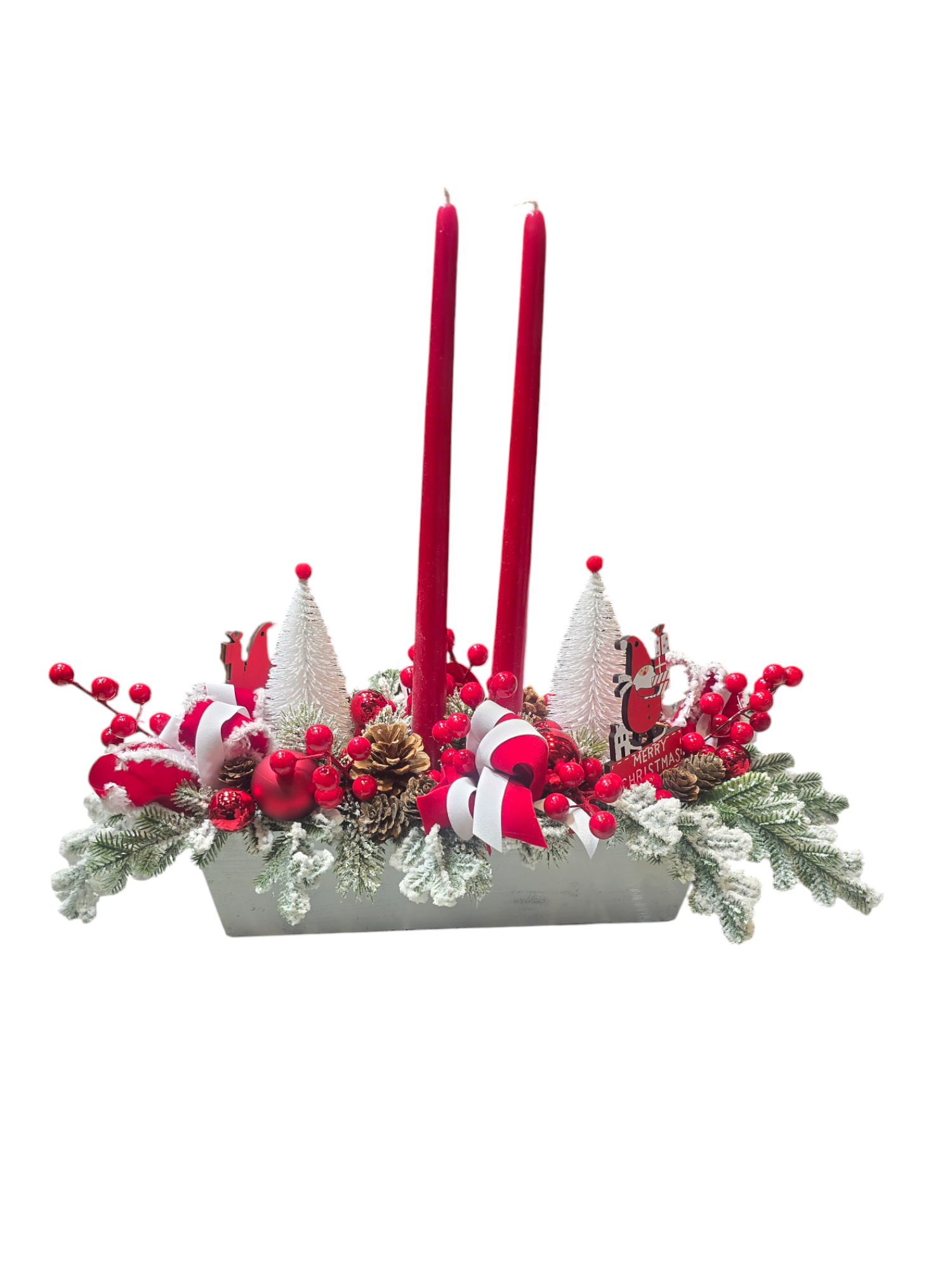 - Due candele rosse affusolate al centro simboleggiano la luce e il calore delle feste.