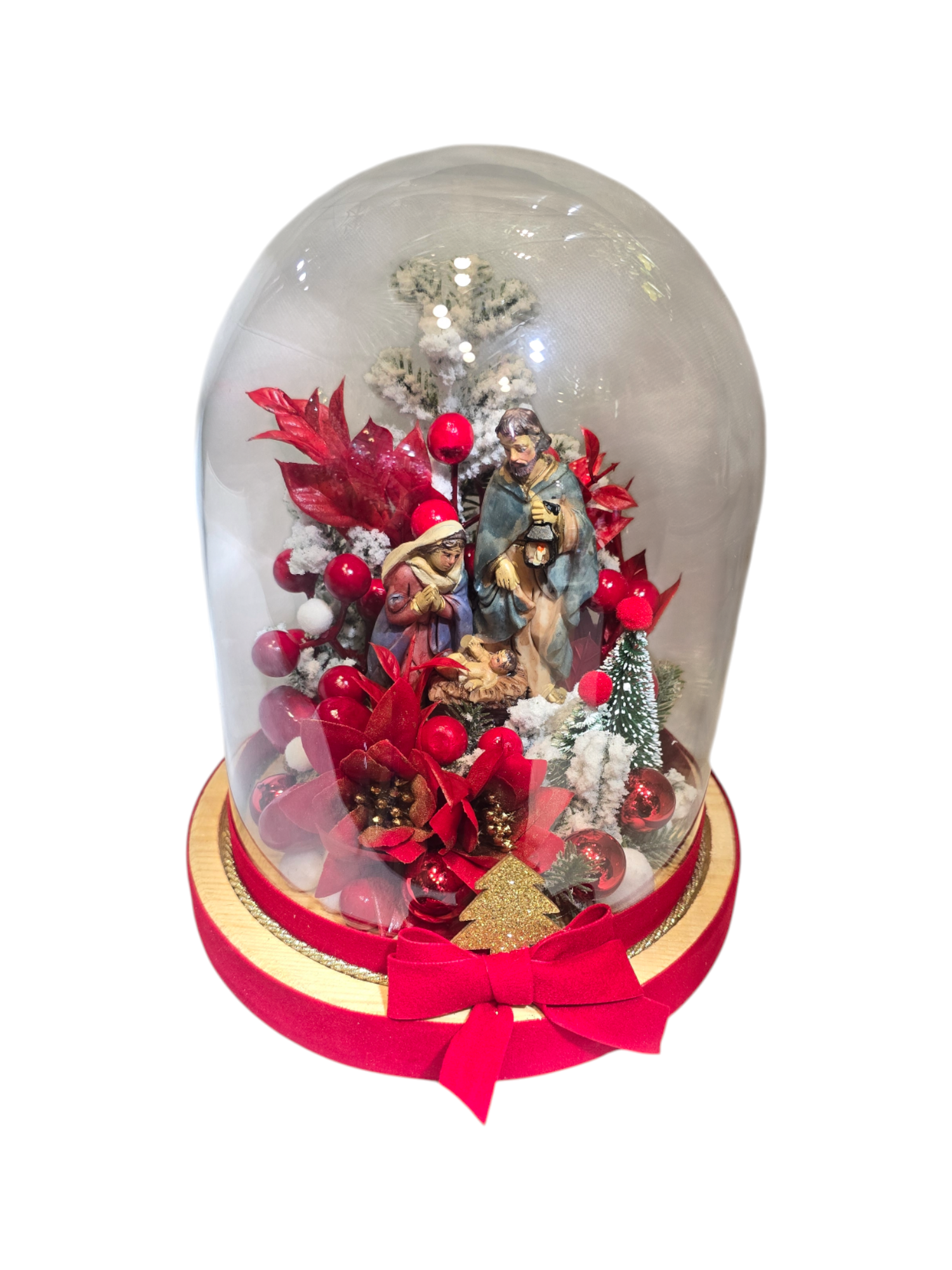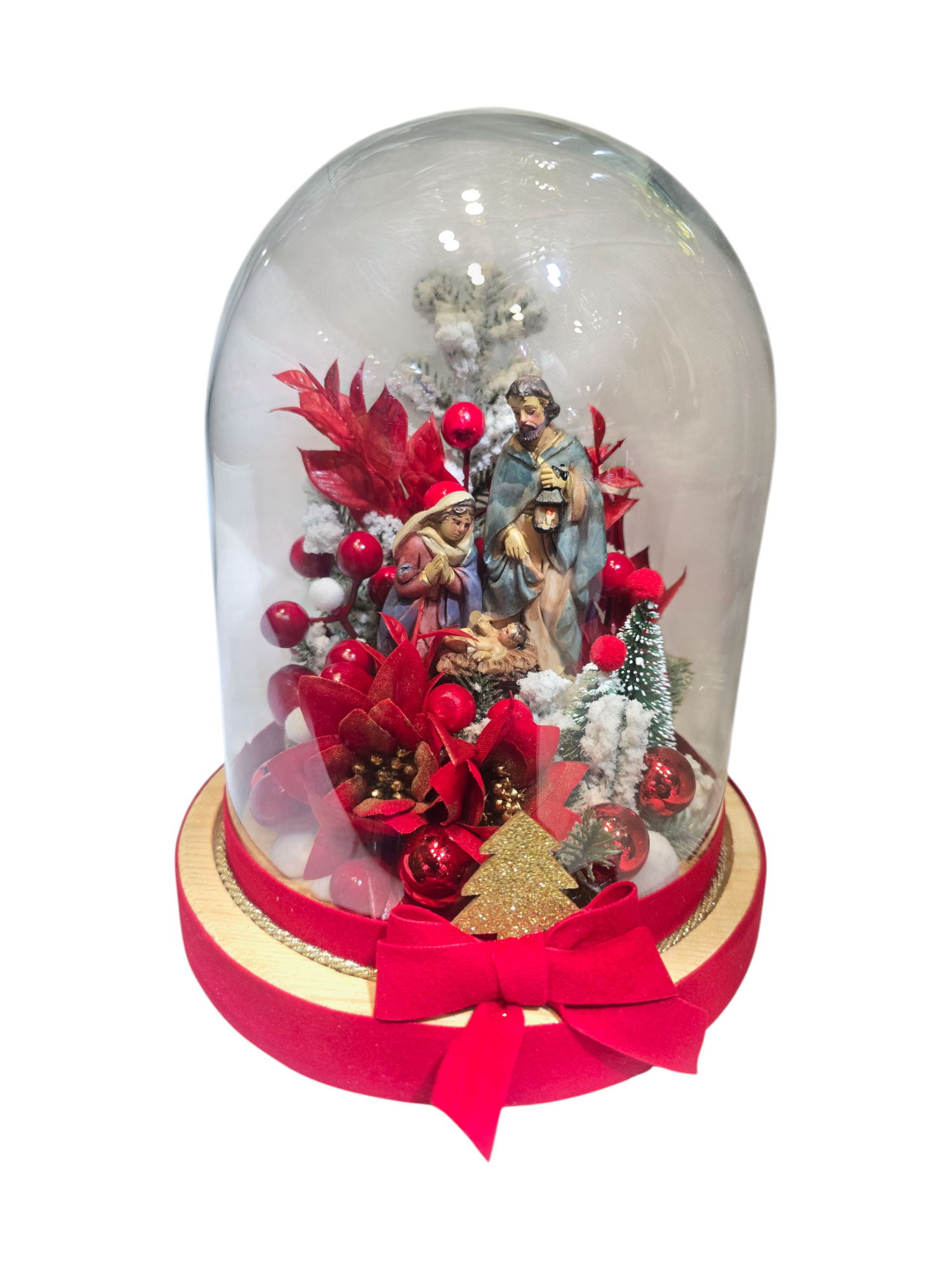 • La Sacra Notte – Scena della Natività con Giuseppe, Maria e Gesù Bambino circondati da fiori rossi, neve artificiale e decorazioni dorate. (disponibile in due versioni quasi identiche)