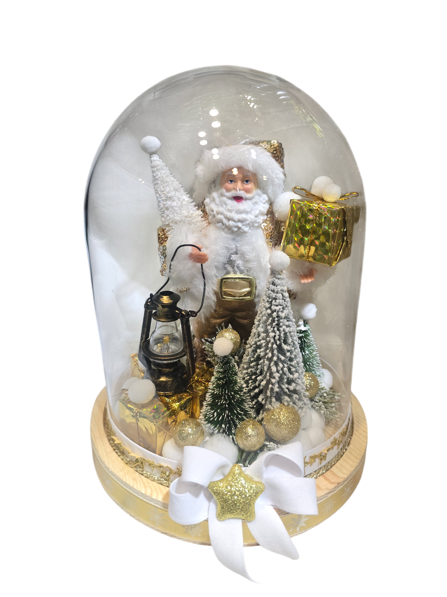 • L’Oro del Polo Nord – Babbo Natale glamour in bianco e oro con lanterna e pacchetti dorati, ideale per ambienti eleganti.