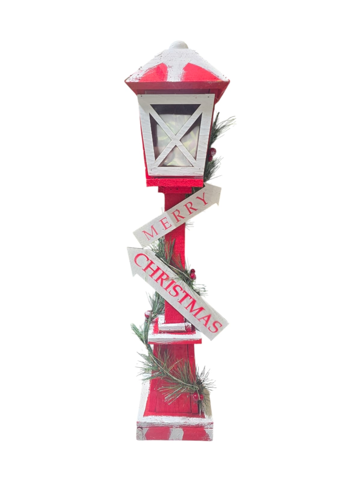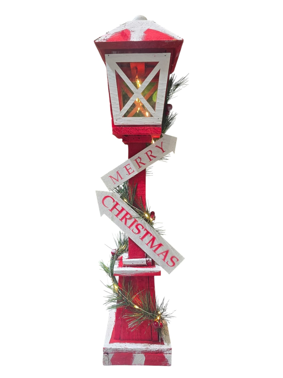 Il lampione è realizzato in materiale plastico rigido e leggero, rifinito nei toni tradizionali del rosso natalizio con tocchi di bianco effetto neve. La forma slanciata e stabile lo rende perfetto come decorazione da terra o da angolo.